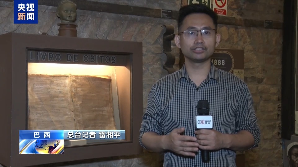 總臺記者 雷湘平:這裡是新黑人研究與記憶中心,也是美洲少見的、與奴隸貿易直接相關的考古遺址。在這片土地之下,長眠著數萬名剛被運抵巴西的非洲奴隸。許多人在被販賣之前,便因疾病、饑餓和勞累而死去。他們被匆匆掩埋於此。我身後是一本死亡簿,記錄的是這裡在1812到1818年間非洲黑奴埋葬於此的相關情況。