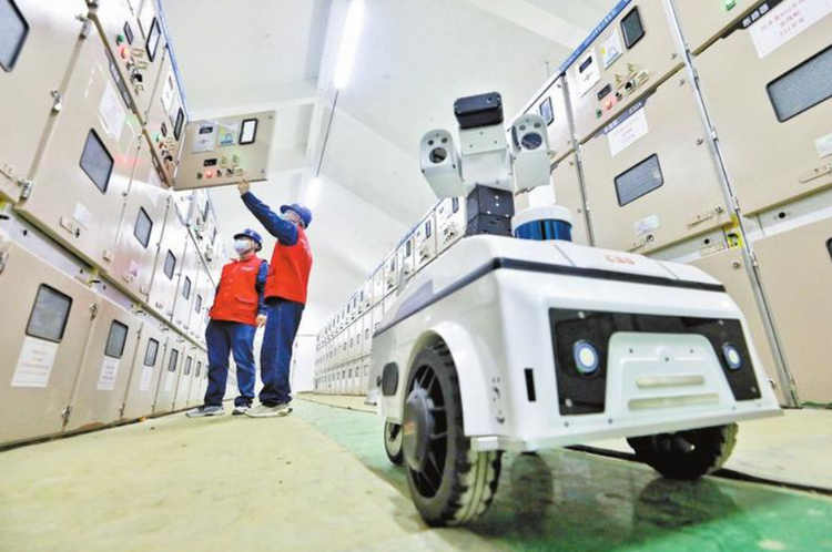 該開關站位於蕪湖古城,2022年1月初開始改造,2022年4月27日完成建設,並初步投運。記者在現場看到,一台純白色的機器人“走在”電力開關櫃間,一對“大眼睛”不時望向櫃中的電纜頭,在它的身後,幾位供電人員正在對開關櫃設備的數據進行分析(如圖)。