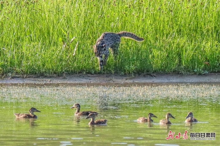 6月18日,筆者在崇信縣汭河拍攝鳥時,突然從蘆葦中竄出一隻淺黃色黑色斑點的貓一樣的動物,對著水中的斑嘴鴨虎視眈眈。在它發現了河對岸的攝影師時,又瞬間鑽入蘆葦叢中,前後只有半分鐘,幸運的是拍攝到了它的照片,後經過確認為國家二級保護動物豹貓。