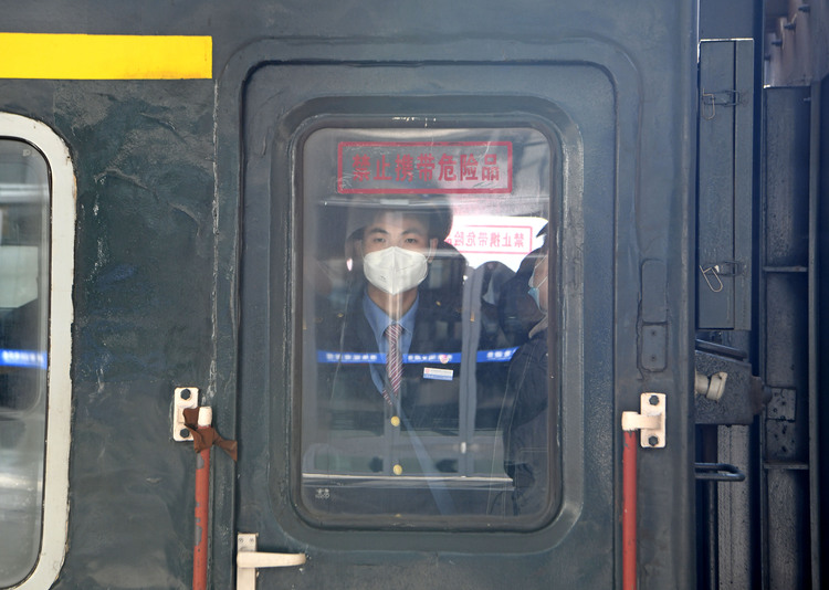 客運值班員隔著車窗玻璃疏導旅客有序乘車