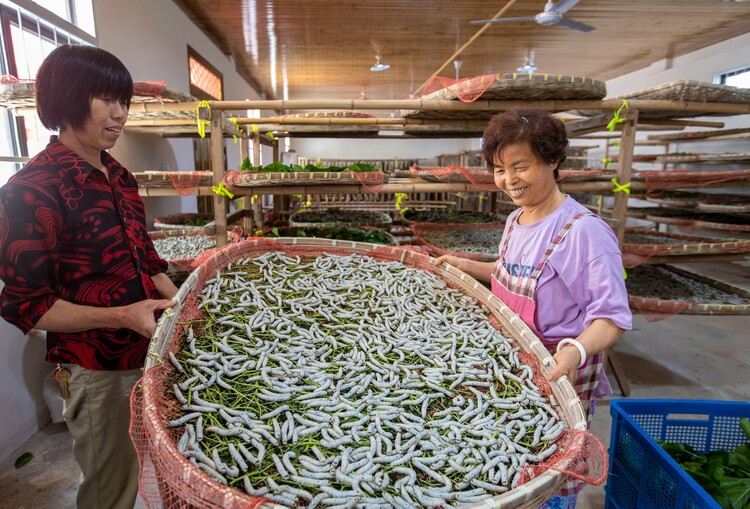 2023年6月2日,在武義縣桃溪鎮澤村養蠶繁育基地裏,養蠶工人們通過孵化方法,飼喂管理,適宜溫度,清掃房間(消毒蠶室),控制密度,合理用葉;適時調換蠶箔位置等加工工序,實行統一飼養,實行統一管理,統一收購,提高養蠶養殖效率。
