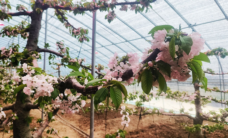 日光溫室大棚內提前發芽開花的櫻桃樹