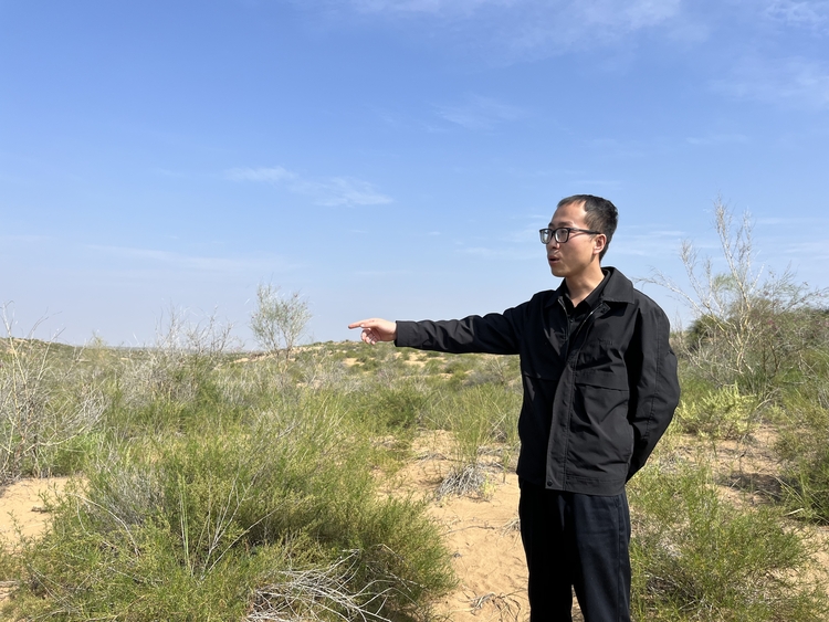 採訪團來到古浪縣北部沙區八道溝,這裡是古浪縣防沙治沙的重點區域。“我們堅持先修路、後治沙,先邊緣、後腹地,先壓沙、後植樹的治沙思路,採用項目治沙、光伏治沙、公益治沙、義務治沙、産業治沙五種方式,全力推進防沙治沙工作。”古浪縣林草局業務幹部龐凱説。如今,八道溝已從原來的沙漠、荒地變得綠意盎然,放眼望去,草方格內佈滿沙米、沙蒿、花棒、梭梭、檸條等耐旱沙生植物,有效“鎖”住了沙。