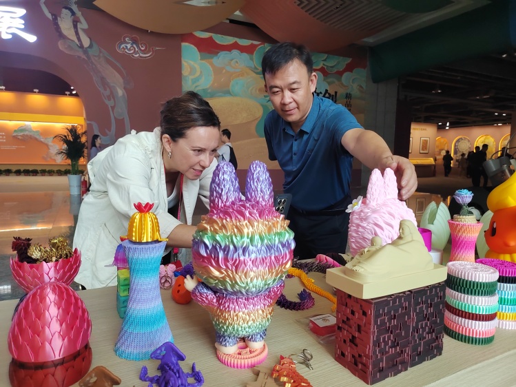 展區內,一排排由3D列印技術呈現的敦煌IP手辦格外吸睛。那些原本靜藏于莫高窟壁畫中的人物,經數字化重建與高精度列印,化身為可觸可感的立體作品。細膩神態與逼真質感讓千年壁畫“走下石壁”,為古老藝術注入新生機。許多嘉賓忍不住拿起作品端詳,感嘆這種“二維到三維”的跨越為敦煌文化傳承拓展了新載體。
