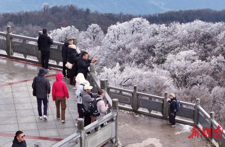 11月18日,張家界天門山景區迎來大面積霧凇奇觀。遊客們紛紛拿出相機手機,記錄這難得的南方冰雪美景。
