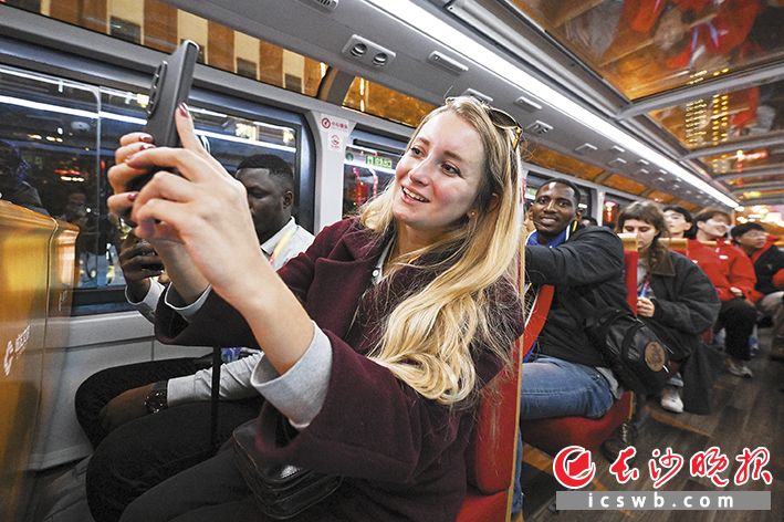 大家登上雙層觀光巴士夜遊長沙,拿出手機拍下沿途美麗夜景。