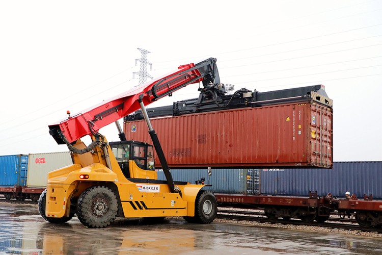 2月11日,滿載汽車配件的集裝箱在株洲陸港被吊裝上車。當天,一列滿載汽車配件的“湘粵非”鐵海聯運國際班列從湖南長株潭口岸經貿發展有限公司專用鐵路鳴笛開出,開往廣州南沙港,再換船出海。這是自2021年“湘粵非”鐵海聯運國際班列開行以來的第2000趟班列。 孟祥琳 攝(湖南圖片庫)