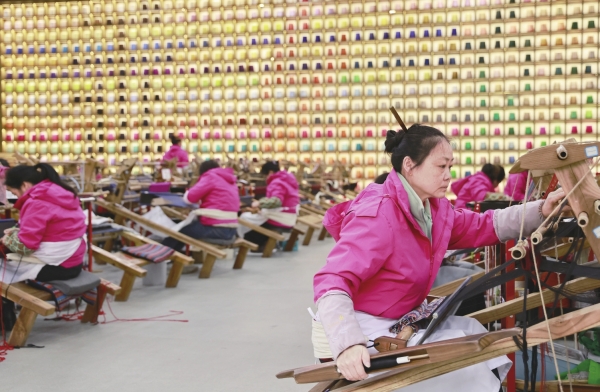 張家界市武陵源區乖幺妹土家族織錦生産研發基地,工人在製作土家族織錦産品。