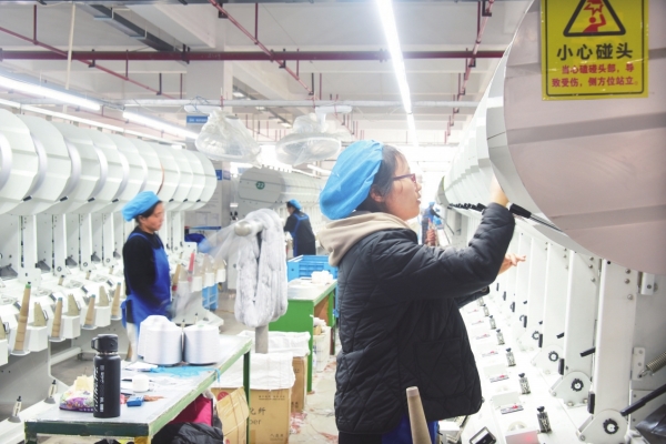 位於澧縣的湖南萌恒服裝輔料有限公司,工人在前紡車間生産線上忙碌。