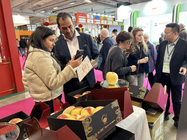 現場工作人員介紹,甘谷蘋果生長在海拔1300米至1800米的黃土高原,全程按照有機標準種植,不使用化學殺蟲劑,吸引多名國際友人手捧蘋果端詳、拍照留念,不少國際消費者當場品嘗後對甘谷蘋果的口感給予了高度認可。