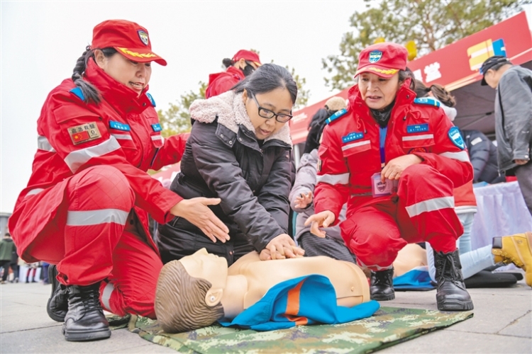 3月4日,內蒙古民間戶外救援協會隊員在指導市民進行心肺復蘇按壓。當日,呼和浩特市“志願服務學雷鋒 文明實踐我行動”主題活動在大召廣場舉辦。活動通過文藝展演、榜樣事跡分享、文明市集等形式,開展各類志願服務,弘揚雷鋒精神與志願風尚,營造全社會參與的濃厚氛圍。 (記者 王磊 攝)