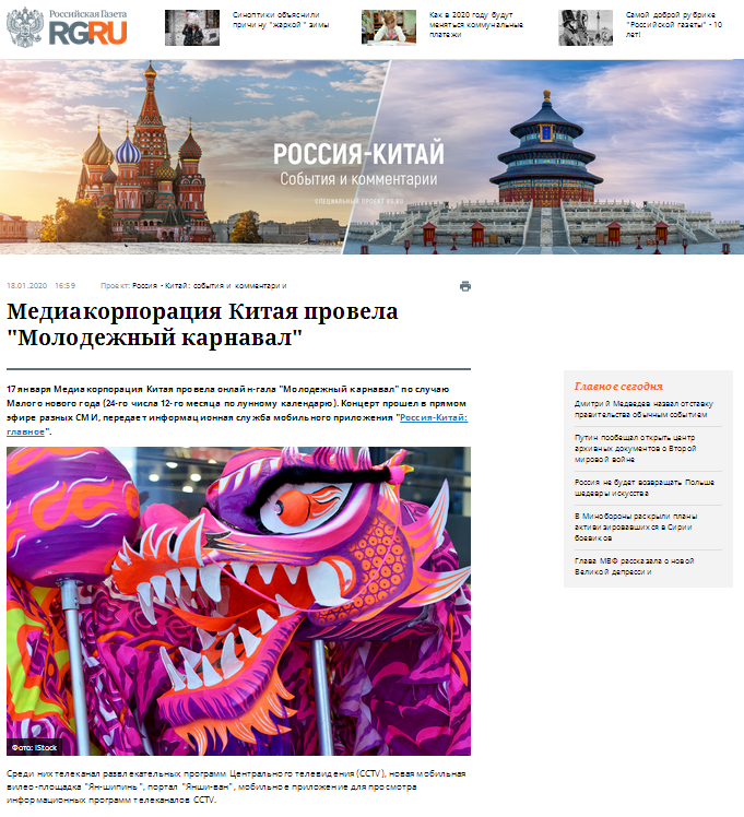 俄羅斯國家政府機關報《俄羅斯報》官網1月18日轉發中俄頭條報道稱,為慶祝農曆新年,中國中央廣播電視總臺17日晚舉辦了網絡春晚。