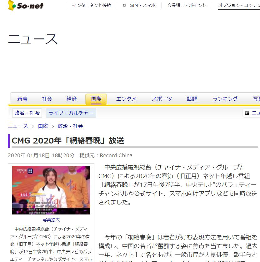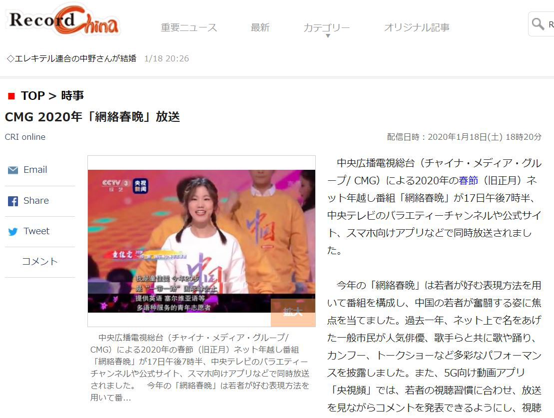 日本最大的中國新聞網站“Record China”18日發佈題為《中央廣播電視總臺2020年網絡春晚播出》的報道。報道稱,今年的網絡春晚採用了年輕人喜愛的表現方式,聚焦中國年輕人奮鬥的姿態。