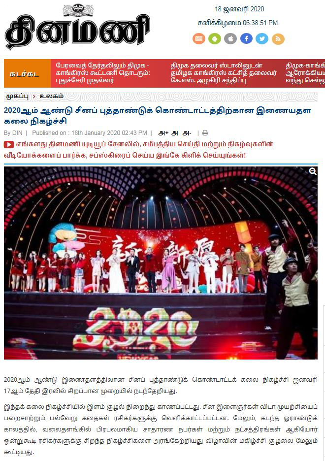 印度主流泰米爾文媒體《每日鐘聲報》網站刊發2020年中央廣播電視總臺網絡春晚的報道稱,作為除夕夜央視春晚的序曲,網晚打通線上線下、貫通小屏大屏,力推多款融媒體産品,打造出一場極具參與感的“青春嘉年華”。