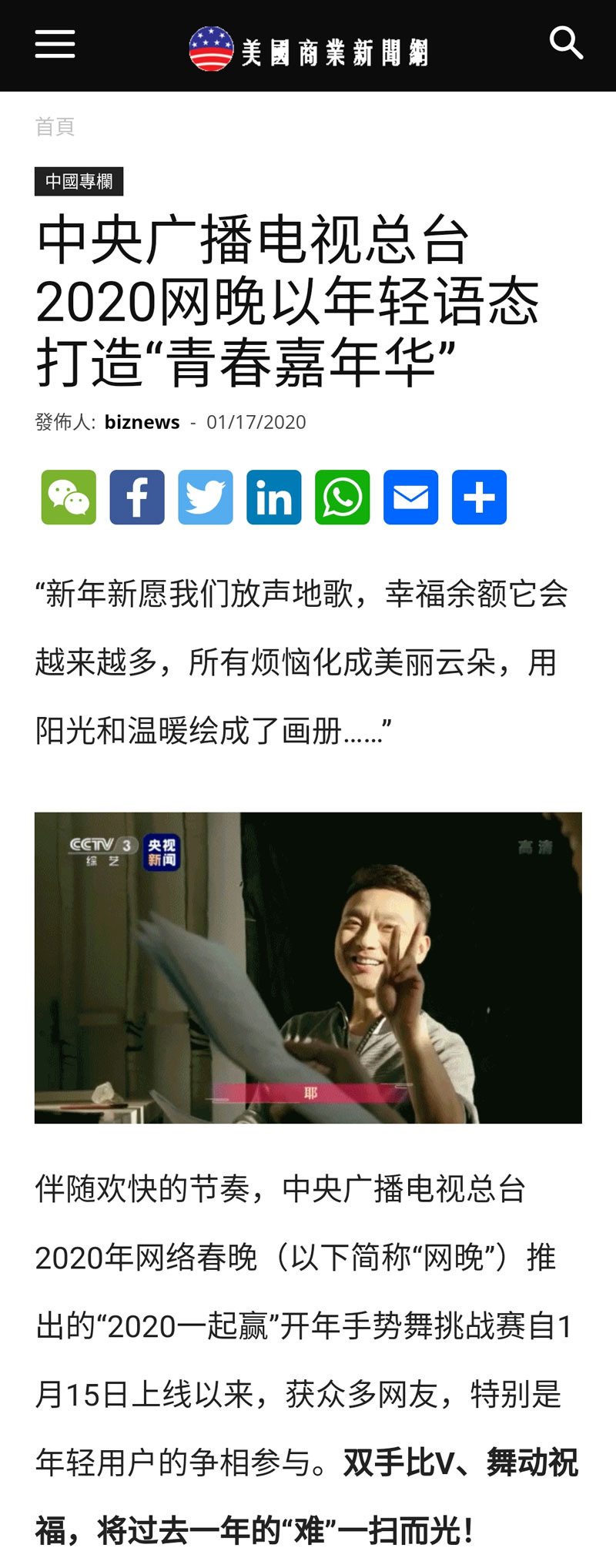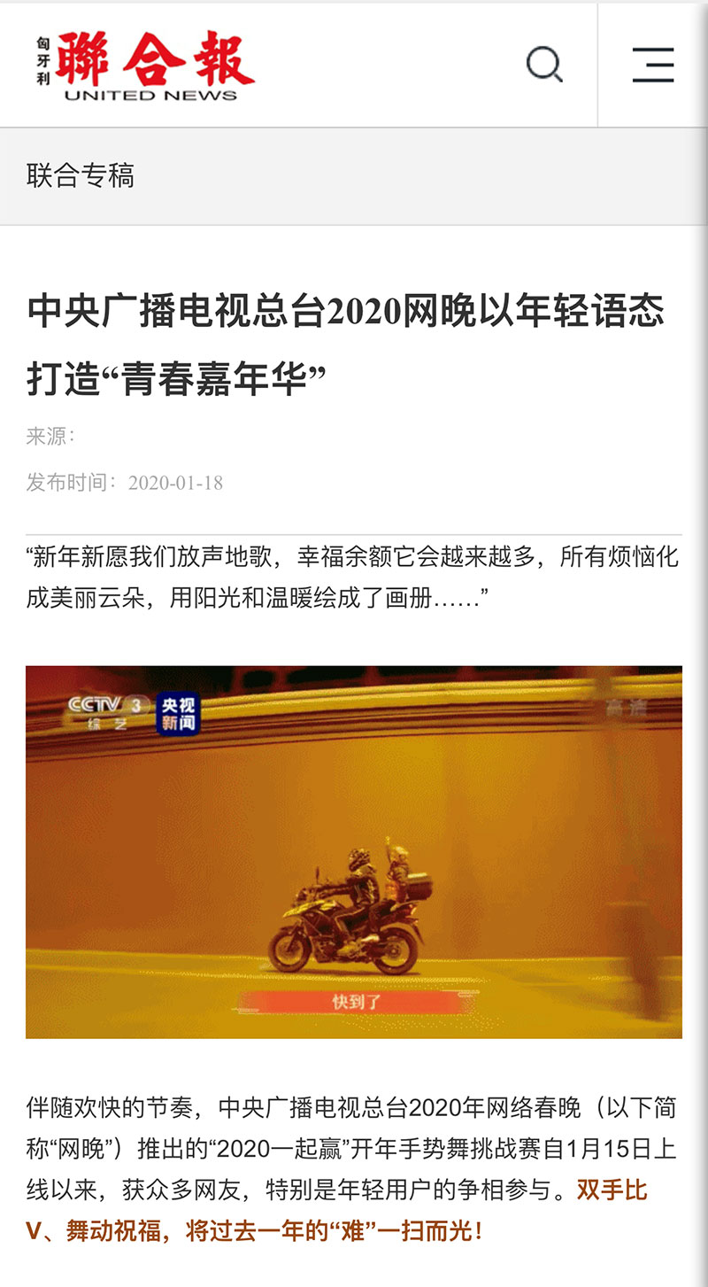《美國商業新聞網》《歐華聯合時報》《匈牙利聯合報》也分別以《中央廣播電視總臺2020網晚以年輕語態打造“青春嘉年華”》對總臺2020年網絡春晚進行了報道。