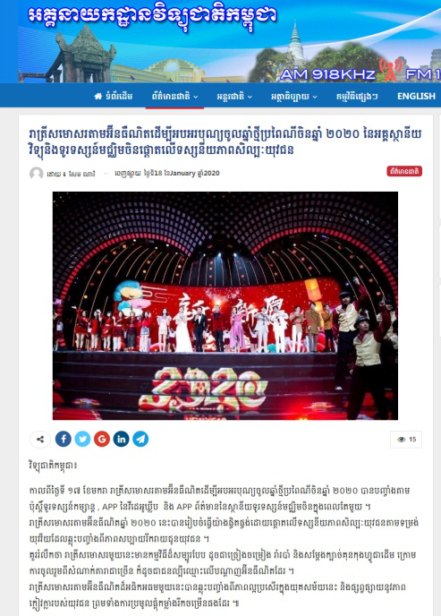 柬埔寨國家電臺官網和柬埔寨新聞部官網1月18日均轉發了總臺柬埔寨語報道《中央廣播電視總臺2020網絡春晚以年輕語態打造“青春嘉年華”》。報道稱,2020年網絡春晚以一種有趣的方式聚焦年輕用戶。晚會集結了正能量短視頻創作者、素人網紅等網絡用戶,共同帶來歌舞秀、功夫秀、脫口秀等豐富多樣的節目,傳遞出青春、美好的正能量。