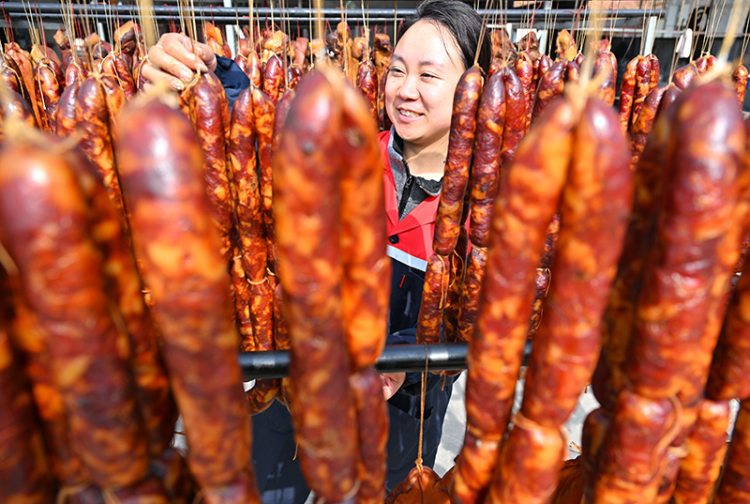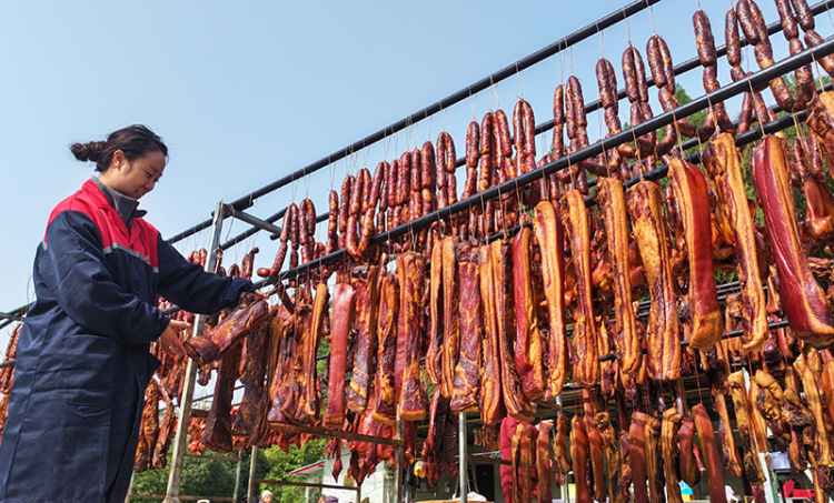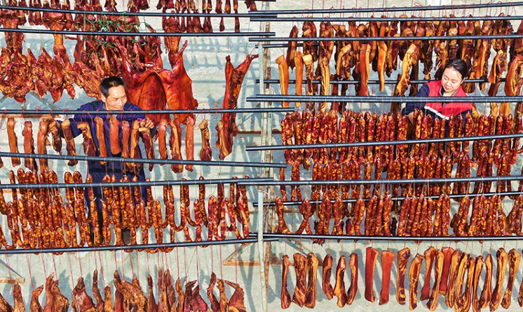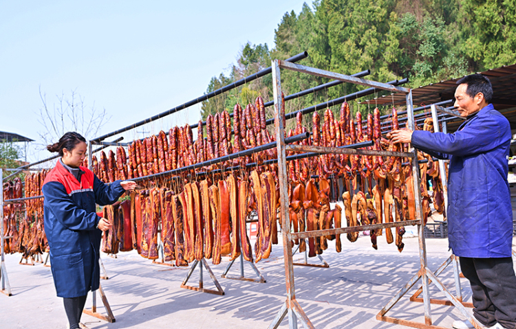 As the New Year approaches, the Senmao Breeding Professional Cooperative in Wengong Town, Renshou County, Meishan City, is busy preparing preserved meats such as sausages and cured pork using traditional local techniques because of the Spring Festival market. Meanwhile, the cooperative also sells its products nationwide through both online and physical stores.