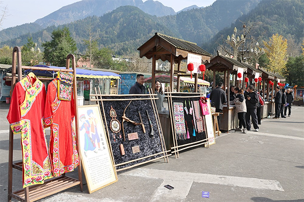 當天,位於主會場周圍的羌韻市集人頭攢動,熱鬧非凡。市集設有非遺技藝展銷區、文創展銷區及特色美食區。此外,身著羌服的NPC工作人員與遊客進行互動,通過答題、對歌對詩等形式,增強遊客的參與性與趣味性。
