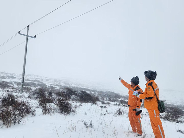 寒潮天氣襲來,國網阿壩若爾蓋縣供電公司唐克供電服務站站長嚴波州和同事扎西澤裏一早便駕車駛入若爾蓋草原的茫茫雪景中。一場雨雪過後,他們要對轄區10千伏線路展開特巡。