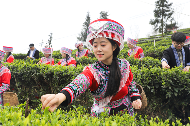 連日來,宜賓興文縣大河苗族鄉九龍山茶旅融合現代農業園區內,早春茶陸續進入採摘期。當地苗鄉群眾身著盛裝,搶抓晴好天氣穿梭在茶壟之間,采收今春第一縷“鮮”機,一幅茶興民富的春日畫卷在山間徐徐展開。