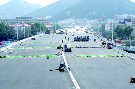 作為二環東路南延項目的橋頭堡,經過一年多的施工,燕山立交橋南側鋪設瀝青,計劃月底恢復匝道交通。本報記者劉飛躍攝