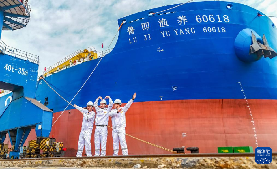 11月15日,由青島國信集團投資建設的15萬噸級智慧漁業養殖工船“國信1號2-2”在中國船舶集團青島北海造船有限公司正式交付運營,命名為“魯即漁養60618”。本次交付的養殖工船在投飼、取水等核心繫統實現升級,將開展鮭鱒魚工船全年連續養殖試驗,構建從育苗到行銷的全産業鏈模式。新華社發(張進剛攝)