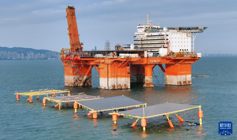 11月19日拍攝的山東煙臺高新區海域浮式光伏平臺和海上光伏實證基地(無人機照片)。