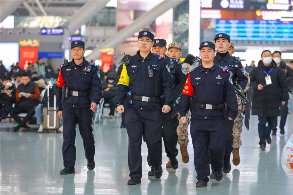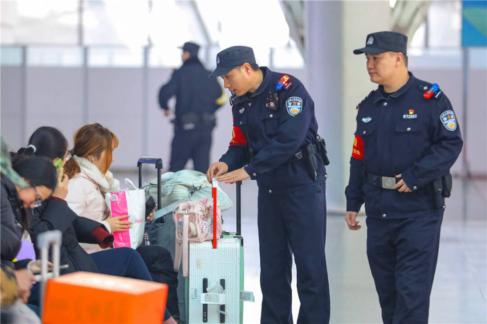 2月2日,在青島火車北站,青島北站派出所民警、輔警在候車室執勤巡邏。張鷹 攝