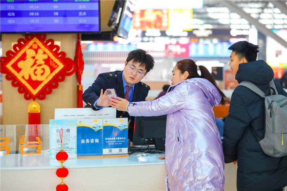 2月2日,在青島火車北站,工作人員為旅客解答出行問題。張鷹 攝