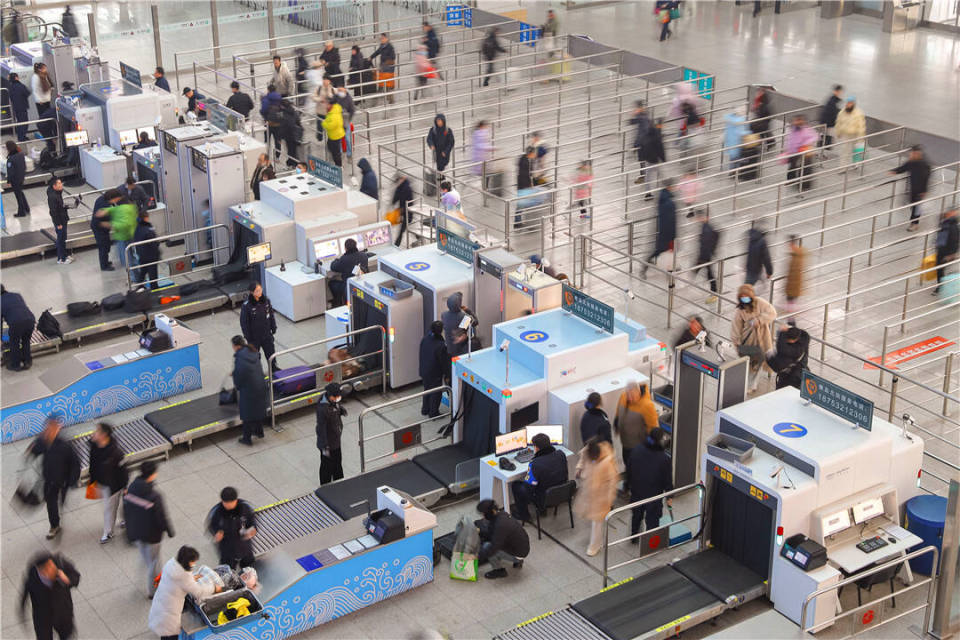 2月2日,在青島火車北站,旅客有序通過安檢進入候車廳。張鷹 攝