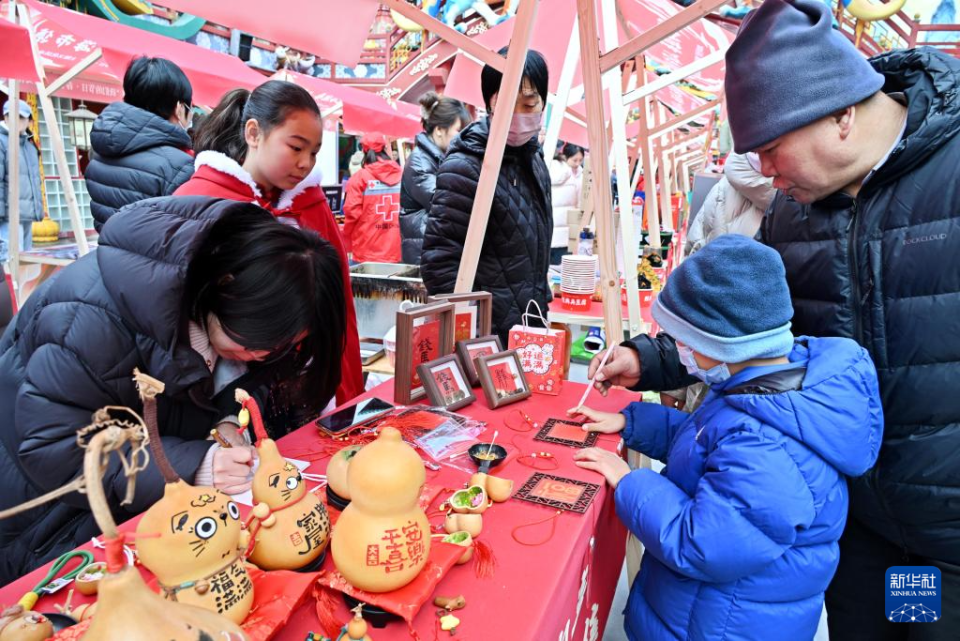 2月10日,在青島市城陽區山海間不夜城主題街區,市民在非遺大集上參與互動體驗。新華社記者 李紫恒 攝
