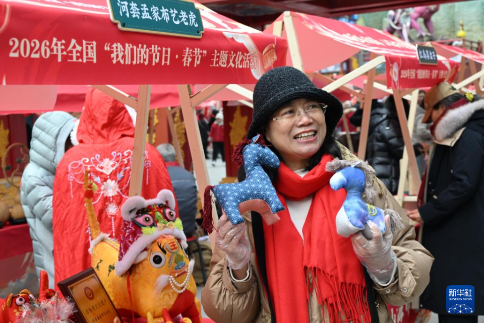 2月10日,在青島市城陽區山海間不夜城主題街區,一名非遺代表性傳承人在展示布馬。新華社記者 李紫恒 攝