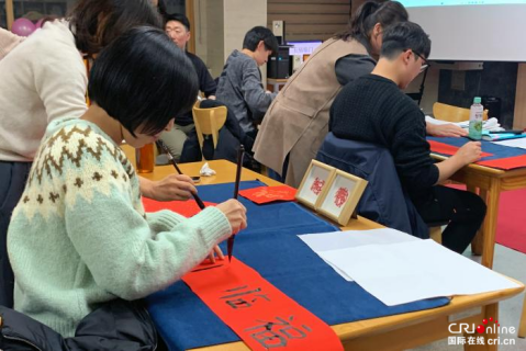 “筆書吉祥”活動中韓國友人用東營“齊筆”書寫春聯 攝影 李好