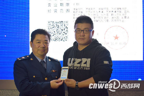11月6日西鹹新區沐光體育文化傳媒有限公司法定代表人郭振南用手機向大家展示了西鹹新區工商局剛剛為他辦出的微信版電子營業執照,標誌著陜西開創了全國手機微信辦照的先河。