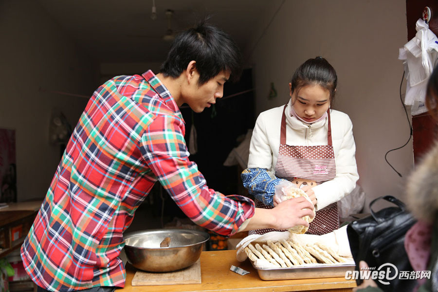 25歲的彬縣小夥武志剛去年年底開始在西安西影路王家村租房做家鄉的石子饃。在附近一家美容院上班的妻子上班前下班後能幫著賣下饃,但大部分時間是他一個人在忙著做石子饃。