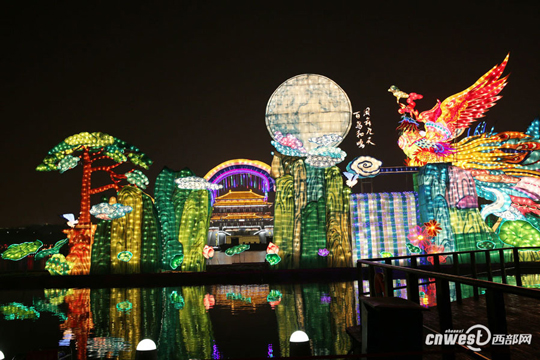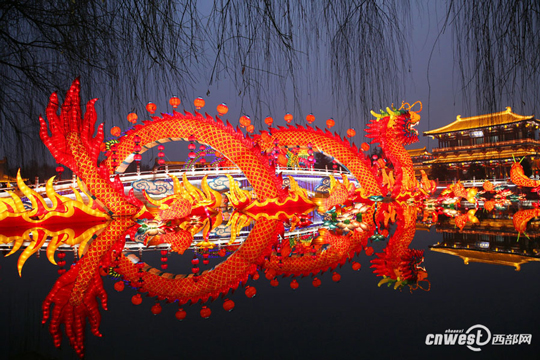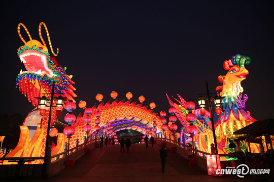 國際在線陜西頻道:1月18日晚,西安大唐芙蓉園新春燈會的綵燈點亮試燈,從西門禦苑門進入,第一眼看到的是穿越芙蓉橋的燈組《龍鳳呈祥》,巨大的龍和鳳在芙蓉橋上盤出閃亮喜迎的彩門,帶給遊人新奇震撼的視覺藝術感受。