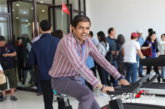 來自印度的中國國際廣播電臺外籍記者那丹在體驗白村的健身器材(王偲瑤 攝)