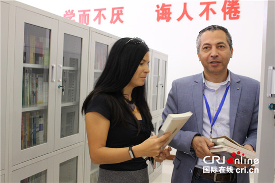 CRI外籍記者在陜西省咸陽市禮泉縣西張堡鎮白村圖書室翻看書籍(王偲瑤 攝)