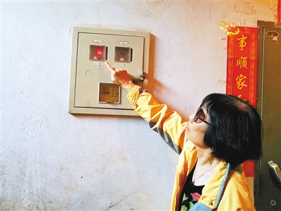劉阿姨查看電錶 記者 劉曉雲 攝