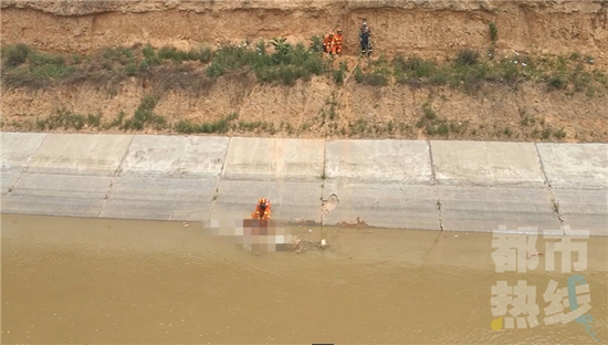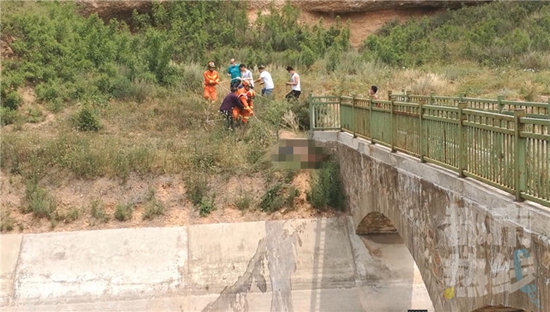消防官兵到場後發現,一具屍體漂浮在水庫旁的水渠裏,水渠寬約10米,深約1米,見此情景,一名戰士在繩索保護下沿著水渠邊靠近浮屍,將安全繩索綁在男屍身上,隨後,岸上官兵一齊將男屍拉上岸。