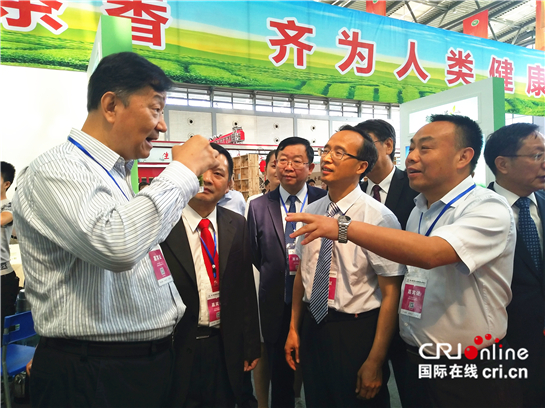 安康市領導陪同中國茶葉流通協會常務副會長王慶(左一)參觀安康富硒茶展館(段曉蕊 攝)