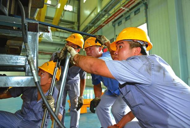 7月4日,西安機車檢修段總裝車間裏,檢修工不顧酷暑炎熱,精心組裝一台檢修後的“和諧”HXD3型機車。 本報記者 巨躍先 通訊員 高陀攝