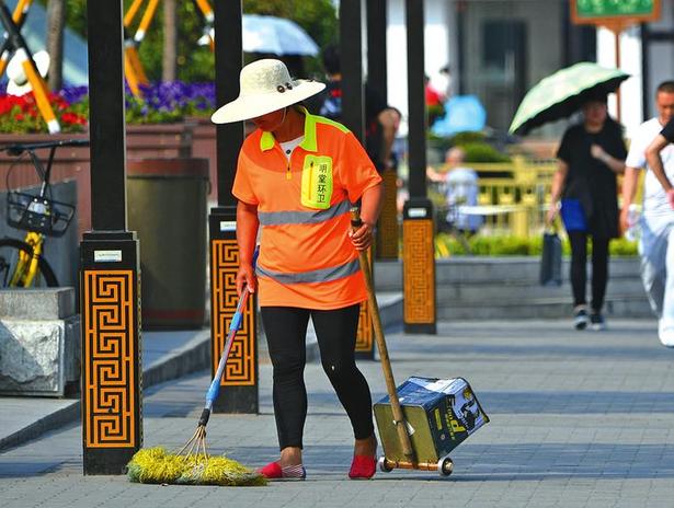 7月3日,西安市鐘樓附近,一位清潔工在烈日下認真工作。 本報記者 劉強攝