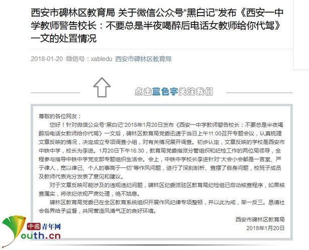 1月20日,有公眾號發佈一篇名為《西安一中學教師警告校長:不要總是半夜喝醉後電話女教師給你代駕》的文章,該文以老師的口吻控訴西安市一中學李姓校長在工作和生活中存在的問題。同日晚些時候,西安市碑林區教育局通過官方微信對文章所述情形進行回應,處置情況稱文章反映的學校是西安市中鐵中學,校長為李進,對文章反映的可能涉及違規違紀問題,碑林區紀委派駐區教育局紀檢組已啟動核查程式。