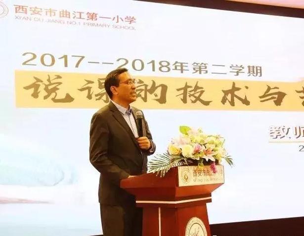 這個群芳競秀的融融四月,西安市曲江第一小學的老師們就經歷了一場妙趣橫生、深入淺出,又讓人醍醐灌頂、豁然開朗的專題培訓講座。4月9日下午曲江第一小學特邀西安市教科所小教部主任、陜西省特級教師馬俊華老師為全體教師進行了一場《説課的技術與藝術》專題培訓講座。