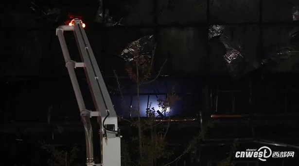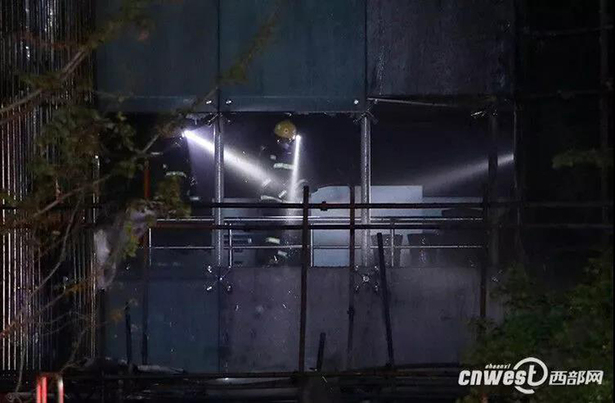 內部明火撲滅,從建行內部四樓有探照燈燈火閃爍,消防人員進入現場清理殘火、排煙作業。