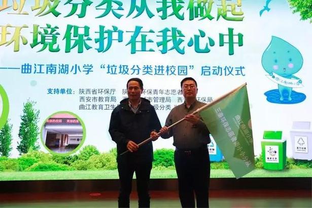 在日常管理方面,南湖小學號召少先隊員們踐行綠色發展理念,安置分類垃圾桶、張貼垃圾分類指引牌,積極營造垃圾分類的良好氛圍。此次授予南湖小學"三秦環保志願者南湖小學小分隊"旗幟,標誌著南湖小學成為陜西省首個互聯網+垃圾分類校園。