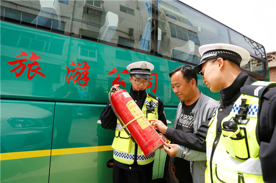 在安全檢查中,民警對車輛安全帶、安全錘、滅火器以及駕駛員行駛證、駕駛證等進行詳細檢查,提醒駕駛員不超員、不超速、不酒駕、不疲勞駕駛,確保假日行車安全。(文/圖 崔正博 編輯 吳宇婷)