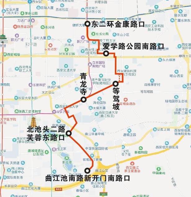 取消曲江池南路新開門南路口、芙蓉東路寒窯路口、芙蓉東路曲江池北路口、唐城墻九區公交調度站、芙蓉東路芙蓉南路口、芙蓉東路中段、北池頭二路芙蓉東路口、北池頭二路立交、北池頭一路八一巷口、新疆三所、鐵爐廟、青龍寺、鐵設院、千戶村、等駕坡、建工路東口、105街坊、愛寧路愛學路口、愛學路公園南路口、愛學路復聰路口、長興路新光巷口、東二環韓森路口、長樂公園西門、東二環金康路口、東二環長樂路口、康複路、安仁坊、朝陽門28個站點。