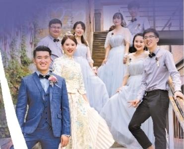 9月7日,身穿結婚禮服的新娘和新郎與伴娘團、伴郎團合影。